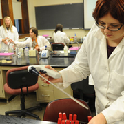 Dr. Kristen Butela, Associate Professor of Biology at Seton Hill University, teaches courses in microbiology and often gives students the opportunity to conduct research with her. She enjoys educating her students through hands-on research because of “the excitement behind not being able to determine what is going to happen in the lab from one day to the next. The student and teacher are in the same boat; we equalize each other.”